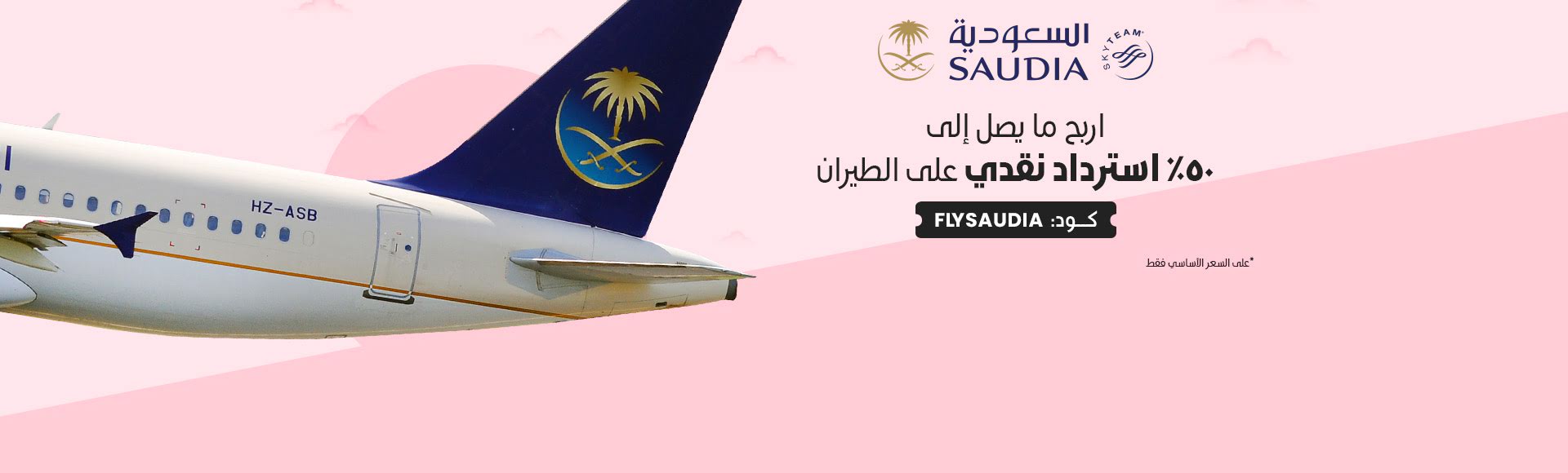 استخدم الكود: FLYSAUDIA وحجز تذاكر طيران السعودية وستكون لديك فرصة لربح ما يصل إلى ٥٠٪ استرداد نقدي.